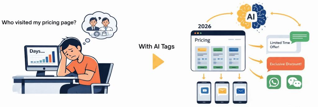 In 2026, AI tags intent the moment it happens—no waiting. Instead of manually selecting “people who visited the pricing page,” the marketing automation triggers a message automatically on SMS, Email, WhatsApp, WeChat, or WeCom because the segmentation happened in seconds, not days.